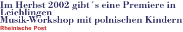 Zum fünften Mal findet im kommenden Jahr das Forum Ost-West statt. Die Initiative des Rheinisch-Bergischen Kreises, die alle zwei Jahre einen deutsch-polnischen Künstleraustausch realisiert, feiert dann Zehnjähriges. Bei diesem kleinen Jubiläum wird es in Leichlingen eine Premiere geben. Auch in den Vorjahren war die Blütenstadt einer der Austragungsorte, es fand zum Beispiel immer ein Jazz-Workshop statt. Bisher waren es fertige Musiker, die als Dozenten oder Interpreten eingeladen waren. Anders im Herbst 2002. Dann werden erstmals polnische Kinder in Leichlingen zu Gast sein, die zusammen mit hiesigen Musikschülern an einem Orchester-Workshop teilnehmen. So wie es mit der englischen Partnerstadt Henley schon längst läuft.