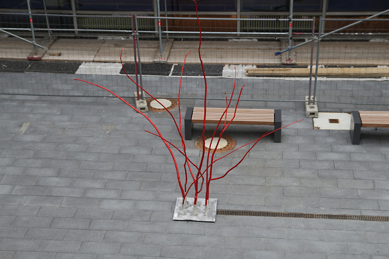 Zwei Bildhauer loten mit ihren teils raumgreifenden Arbeiten die neuen Möglichkeiten aus, die sich gleichzeitig mit den Gegebenheiten einer sich konstant ändernden Baustelle arrangieren müssen.